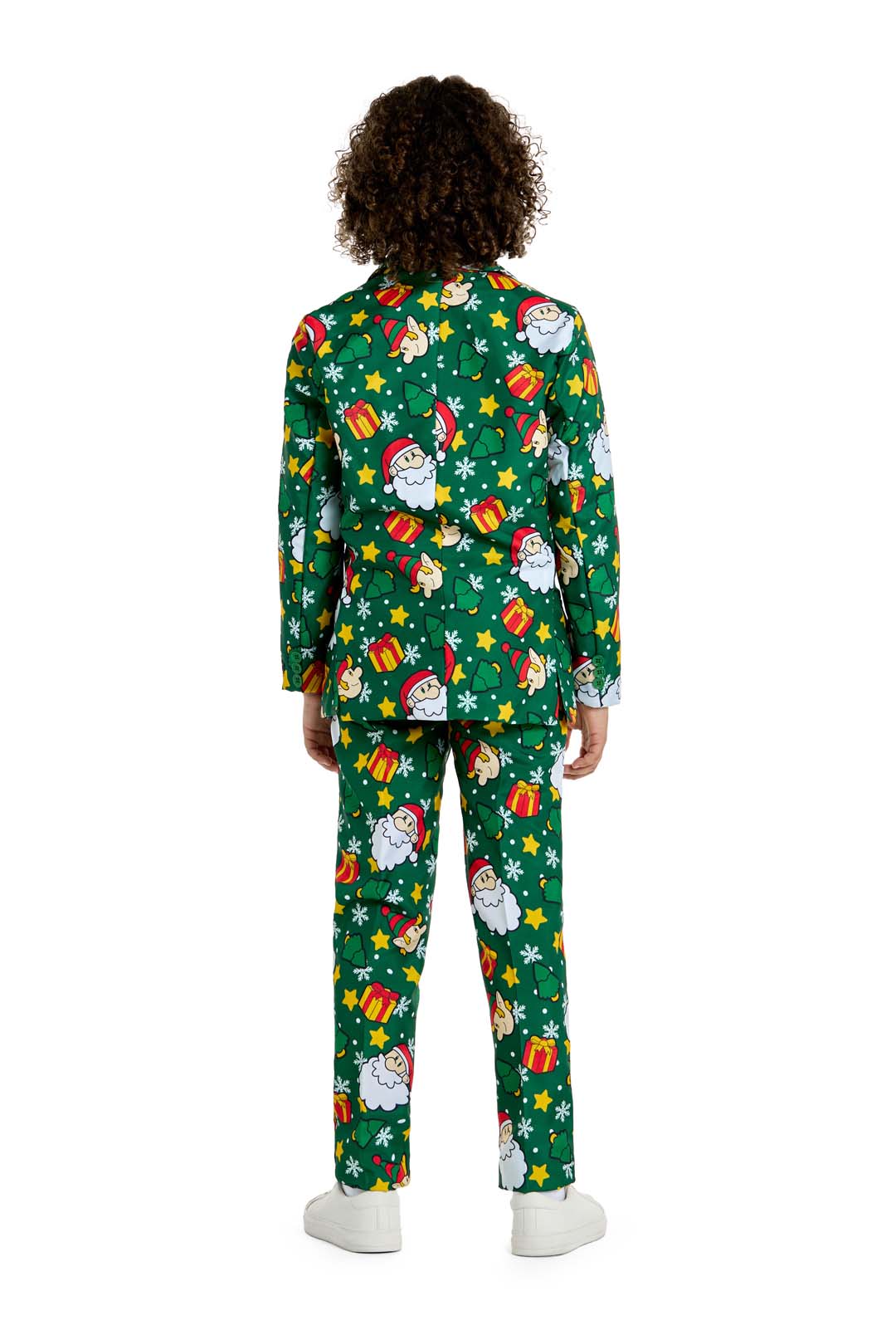 This green Christmas suit for boys features presents, trees, elves and Father Christmas; perfect for dinner.