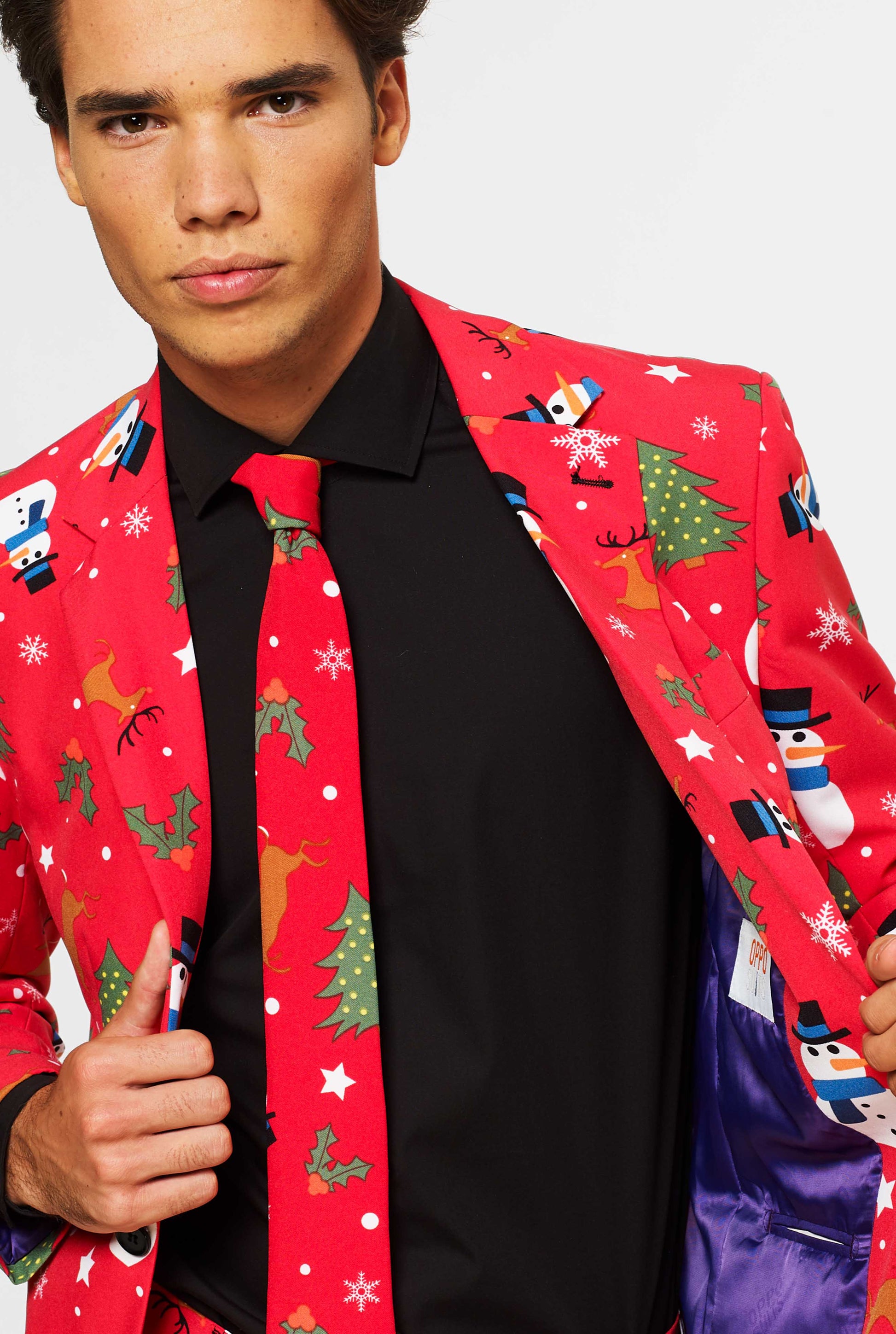 Word de baas van het kerstfeest met het OppoSuits Christmaster kostuum – dé ultieme outfit voor mannen die hun feestdagen serieus nemen. Dit opvallende rood-groene kerstpak is rijkelijk versierd met klassieke kersticonen zoals rendieren, kerstbomen en sneeuwvlokken. Stijlvol, vrolijk en net fout genoeg om onvergetelijk te zijn.