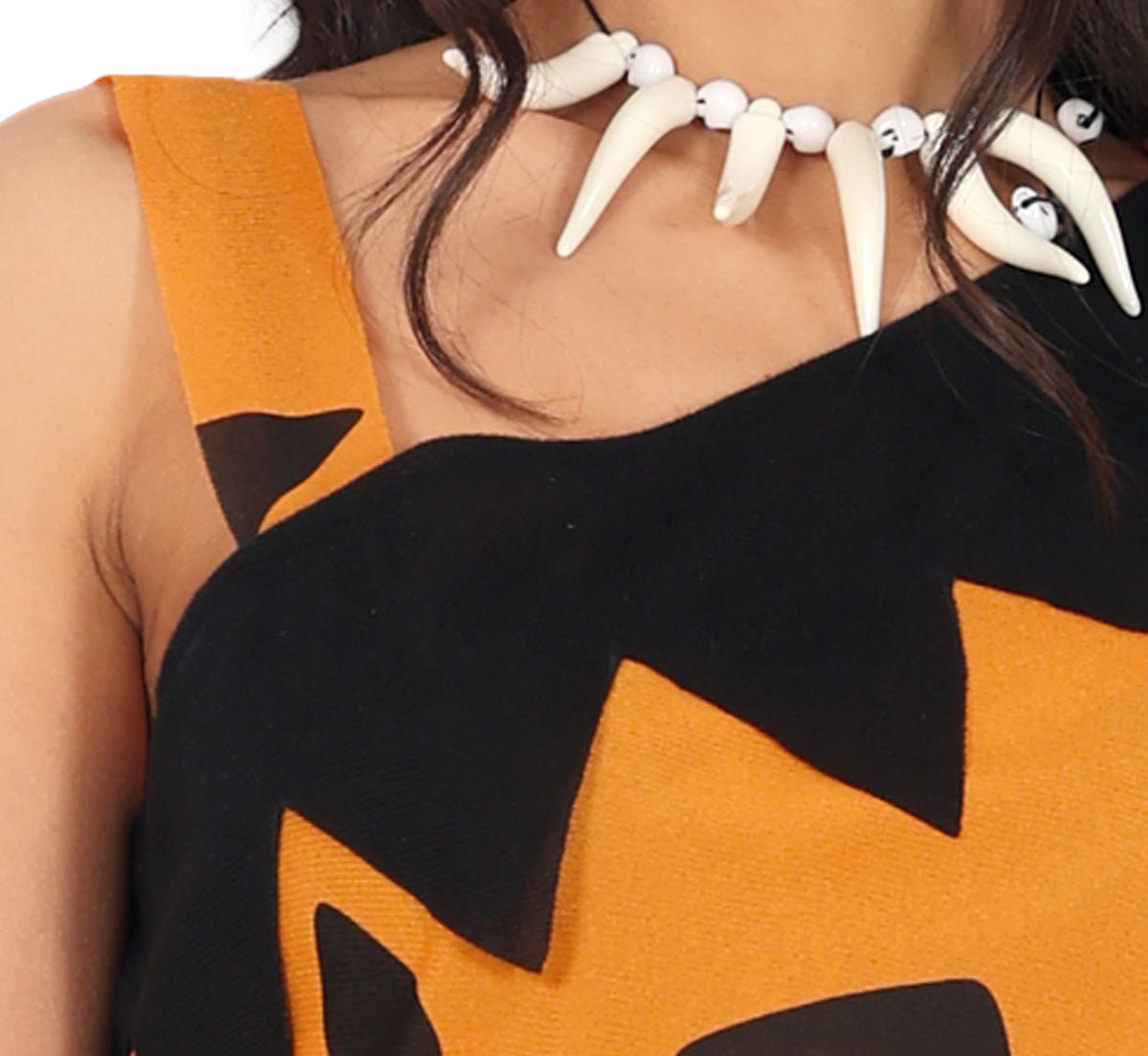Ga terug naar de oertijd met deze opvallende holbewoner jurk voor dames in zwart en oranje. Dit speelse en originele kostuum is perfect voor carnaval, themafeesten, verkleedpartijen en zelfs schoolvoorstellingen. Met deze outfit stap jij rechtstreeks uit de steentijd het feest binnen. 🦴🔥