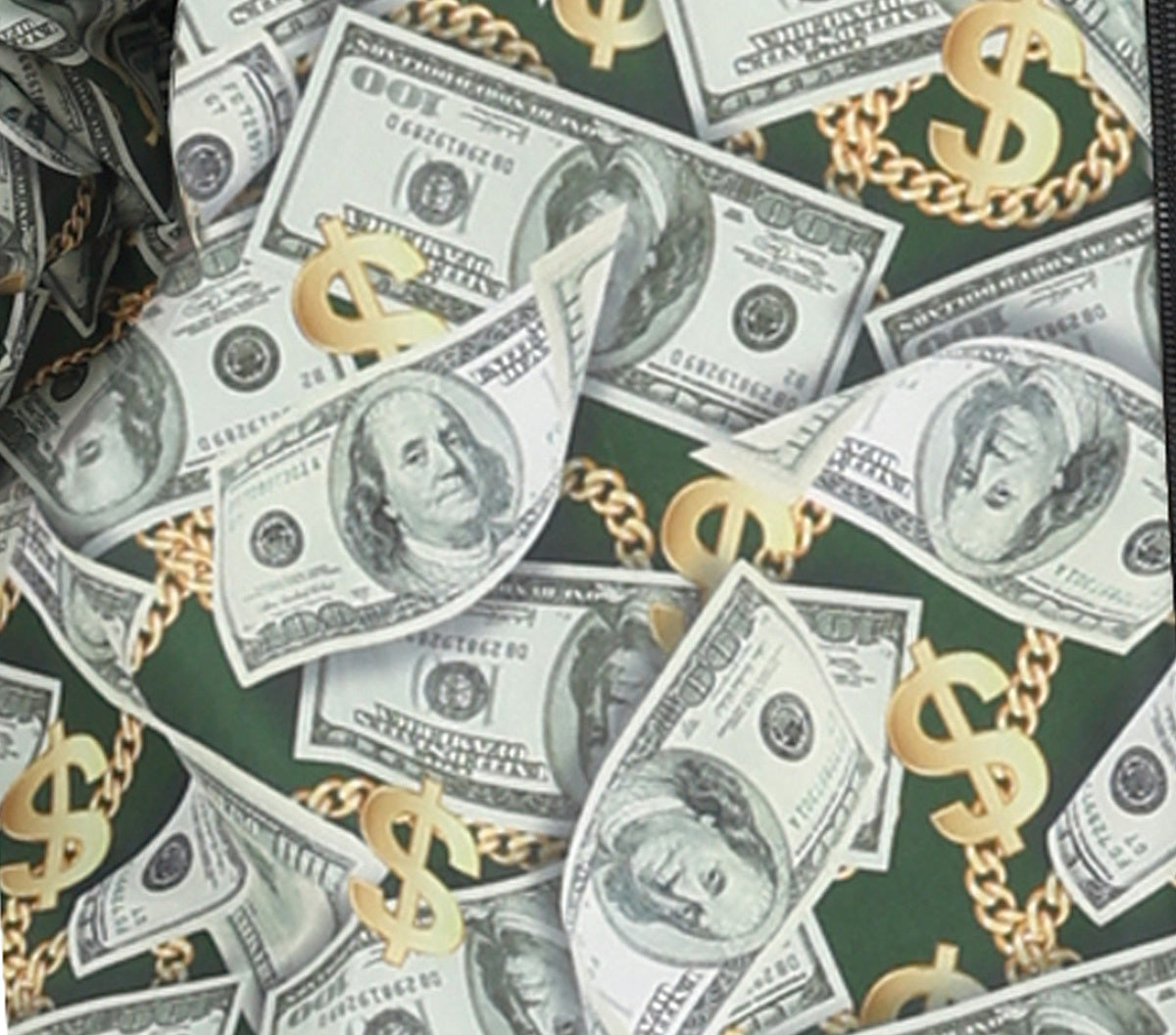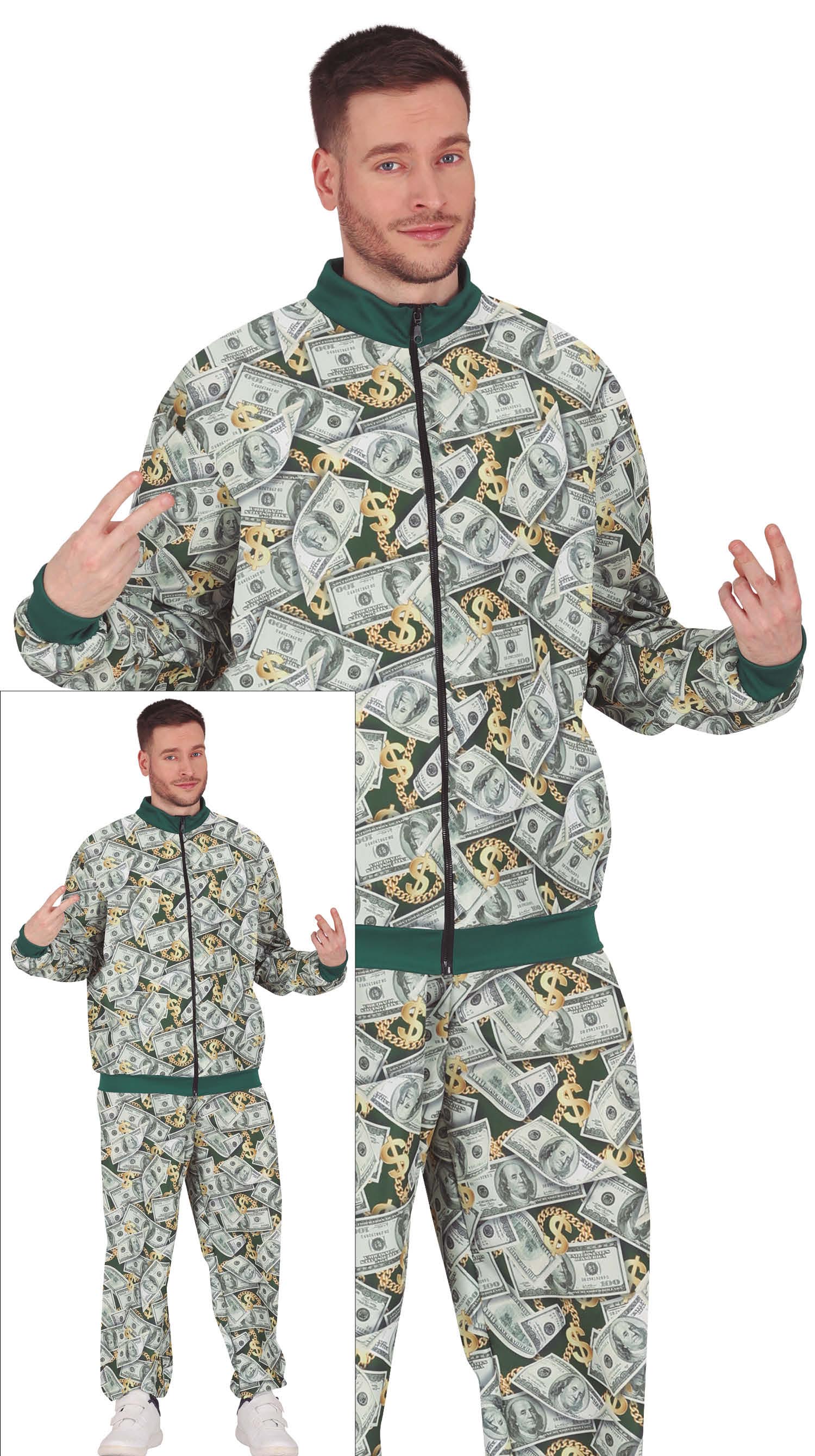 Met dit Biljetten Trainingspak voor heren kom je het feest binnen alsof je net uit een geldregen bent gestapt. Groen, opvallend en vol dollar- of biljettenprint: dit pak is perfect voor iedereen die graag een rijkelijk overdreven entree maakt.